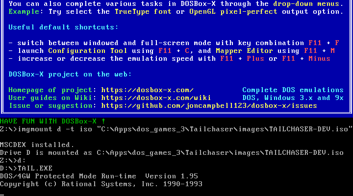 The developer very kindly provided a free version of Tailchaser on his site. The problem is that to get it working in Dosbox, you have to mind a couple of details.